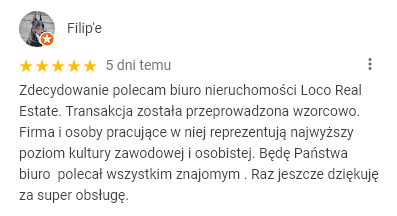 Moge z czystym sumieniem zarekomendować usługi firmy LOCO jako bardzo rzetelne i profesjonalne biuro pośrednictwa nieruchomościami. Pozdrawiam serdecznie !!