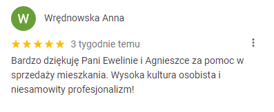 Pani Agnieszka Kałuża jest profesjonalistką w każdym calu. Spokojna, opanowana a także wspierająca. Masa celnych wskazówek, które sprawiły, że mieszkanie od momentu przekazania kluczy Pani Agentce, zostało wynajęte po kilku dniach. Dzięki poradom, moje mieszkanie stało się bardziej atrakcyjne dla potencjalnych wynajmujących. Co dla mnie także ważne – z Panią Agnieszką kontakt był wzorowy. Wiedziałem na jakim etapie jesteśmy i jakie czynności formalne mam wykonać, podczas finalizacji wynajęcia mieszkania. Bardzo polecam współpracę z Panią Agnieszką. 🙂