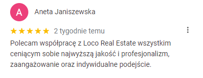 Usługi pośrednictwa na każdym ich etapie zostały wykonane w sposób bardzo profesjonalny. Jesteśmy pod dużym wrażeniem rzetelności, kompleksowości i wysokiej jakości świadczonych usług i z przyjemnością rekomendujemy współpracę z LOCO Real Estate.